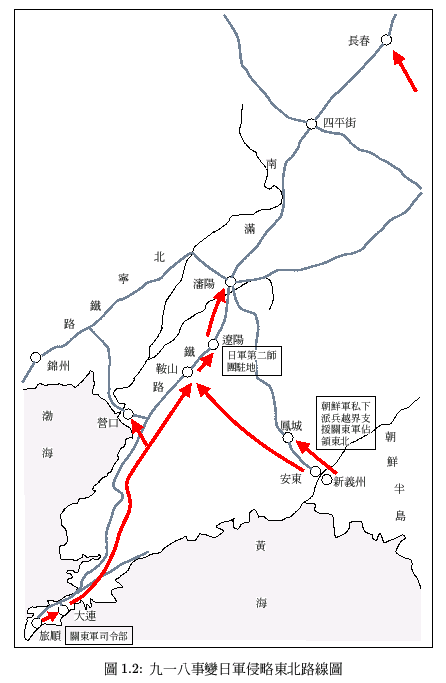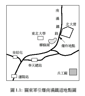 一九三一年九月十八日晚上十时,日本关东军的南满铁路守备队柳条湖分队队 附河本末守中尉,带领着六位全副武装的部属,出外进行夜间的巡察。巡察的地 点,正在中国东北军政中心沈阳市的最大驻军地点-北大营附近的铁路沿线。在 他们的背包之中,还夹带着炸药、引信以及野战电话机。在中国东北的九月夜间 ,已经是有着秋凉的寒意,但是对於这些出巡的关东军而言,心里则是充满了膨 胀的杀机,他们知道他们准备要「破坏」中国的铁路,假如中国的部队要想阻止 他们的行动,他们将格杀勿论。