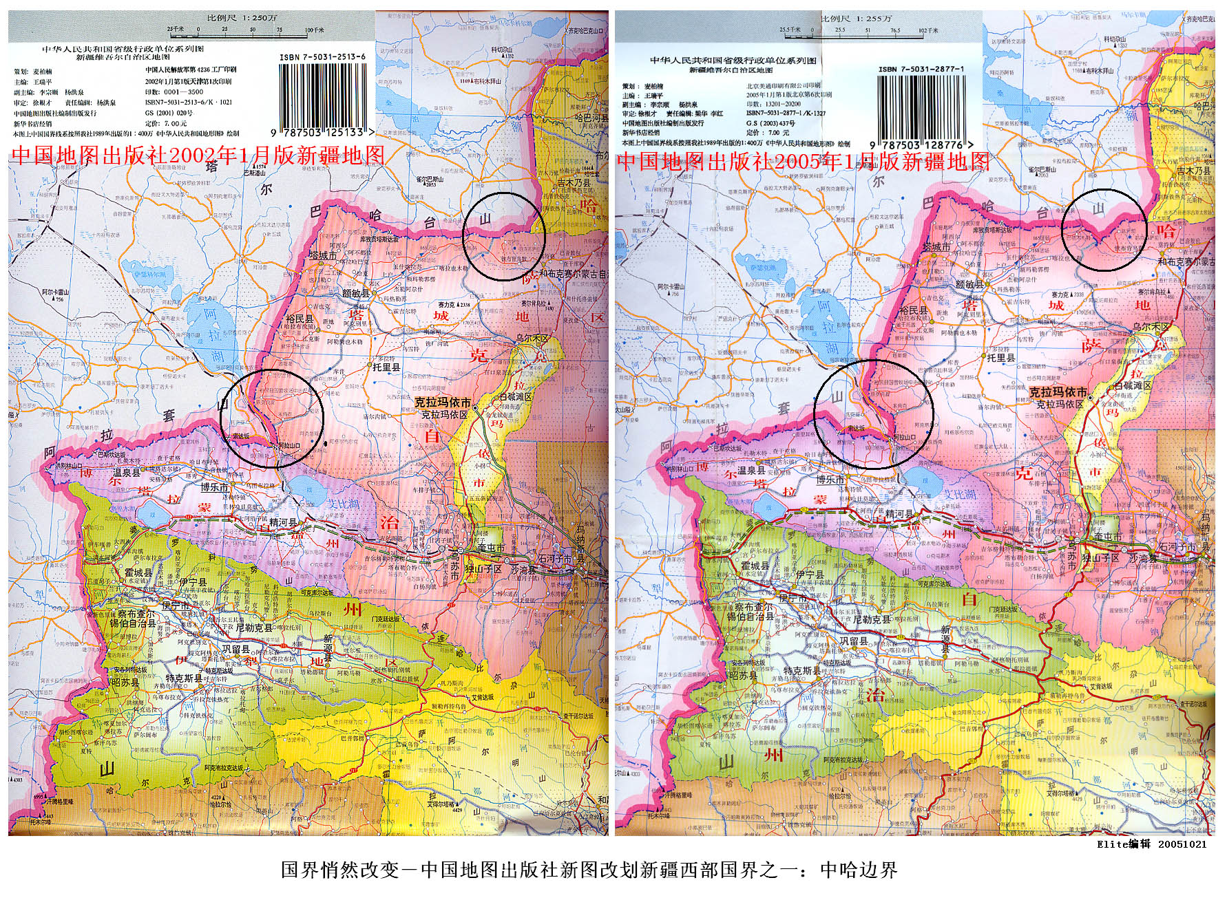 震惊不已-中国悄然改划新疆西部国界 前天买了一幅中国地图出版社2005年1月新版的《新疆地图》,经过和手头保存的2002年1月版新疆地图对比,发现在2005年版地图中,虽然新疆西部国界在帕米尔仍沿用“未定国界”,但是在中哈、中吉、中塔其他地段的国界已经悄悄改画。这可以看作中国与邻国的边界条约的最新标定。